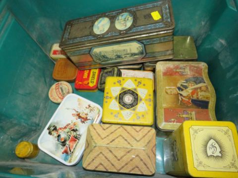 A BOX OF VINTAGE TINS TOGETHER WITH VINTAGE SAMOVAR TYPE VESSEL