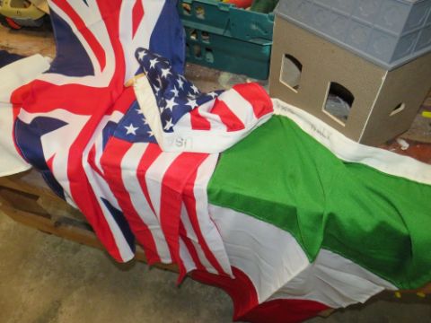 A SELECTION OF ASSORTED TOYS, HARDWARE, VARIOUS WORLD FLAGS AND A FRAMED PICTURES