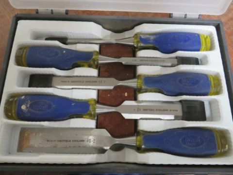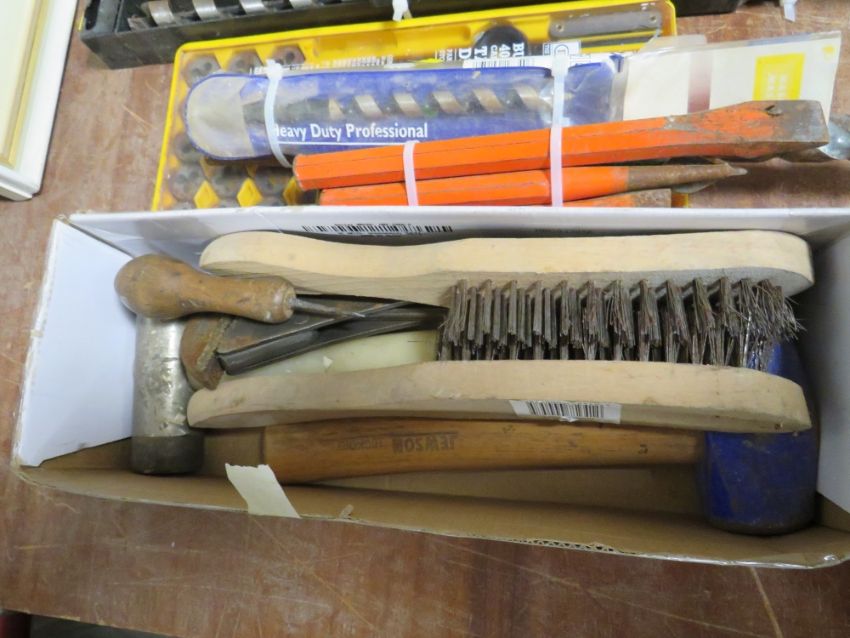 ASSORTED TOOLS TO INCLUDE TAP AND DYE SET, VARIOUS DRILL BITS, OLD CHISELS/ WOOD WORK CHISELS
