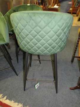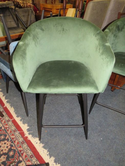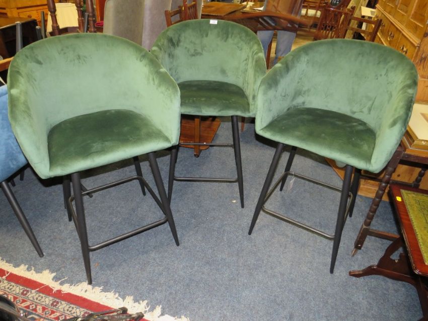 THREE MODERN UPHOLSTERED EMERALD GREEN BAR/KITCHEN STOOLS