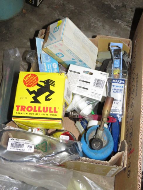 TWO BOXES CONTAINING VARIOUS HOUSEHOLD MAINTENANCE HARDWARE AND TOOLS