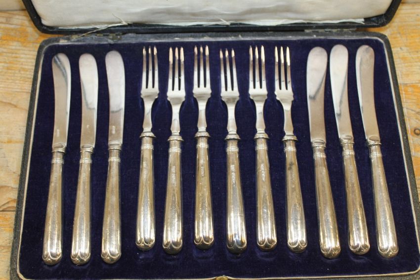 A SET OF HALLMARKED SILVER HANDLED CAKE KNIVES & FORKS IN PRESENTATION BOX