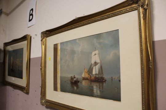 A PAIR OF GILT FRAMED AND GLAZED CONTINENTAL WATERCOLOURS OF BOATS ON THE SEA - H 34.5 CM W 54.5 CM