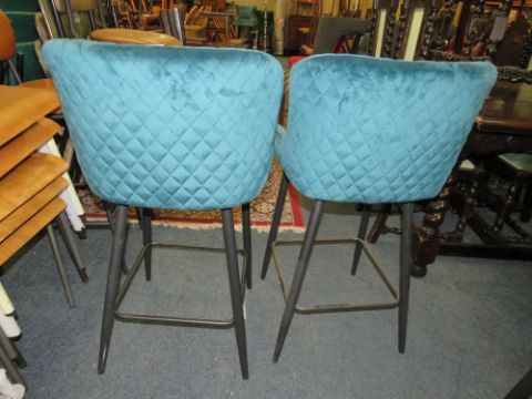 A PAIR OF MODERN GREEN UPHOLSTERED KITCHEN STOOLS