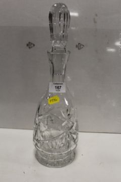 A PAIR OF SILVER PLATED BOTTLE COASTERS TOGETHER WITH A SELECTION OF CUT GLASS DECANTERS ETC