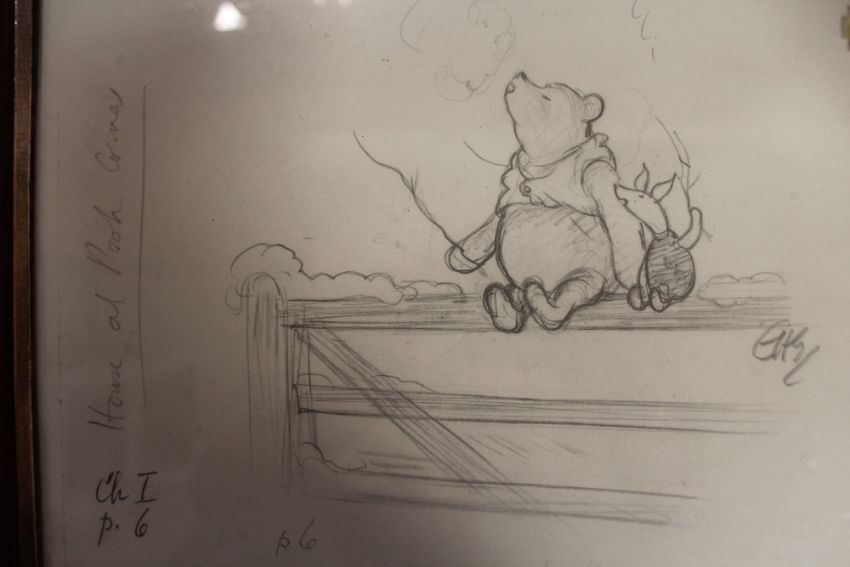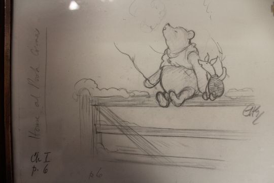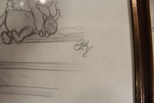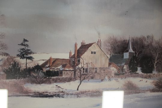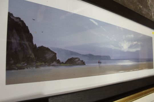 A FRAMED AND GLAZED SIGNED PRINT OF A WINTER FARM SCENE TOGETHER WITH A LANDSCAPE BEACH SCENE AND A WINNIE THE POOH PRINT (3)
