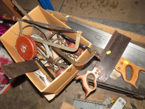 VARIOUS HAND SAWS, MITRE TOOL AND CARPENTERS TOOLS