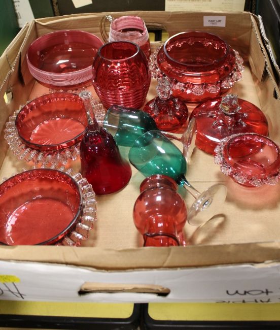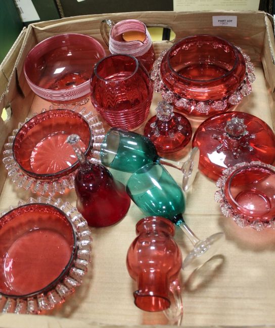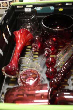 TWO TRAYS OF ASSORTED MODERN AND VINTAGE CRANBERRY GLASSWARE ETC TO INCLUDE DRINKING GLASSES, A JUG AND BOWL SET ETC