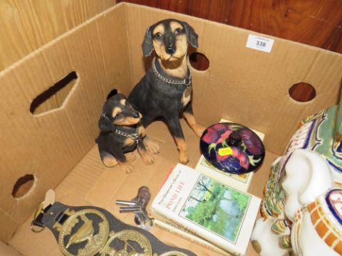 A TRAY OF ASSORTED COLLECTABLES TO INCLUDE OBSERVER BOOKS, ARTIST BOXES, MOORCROFT LID, ELEPHANT FIGURE ETC