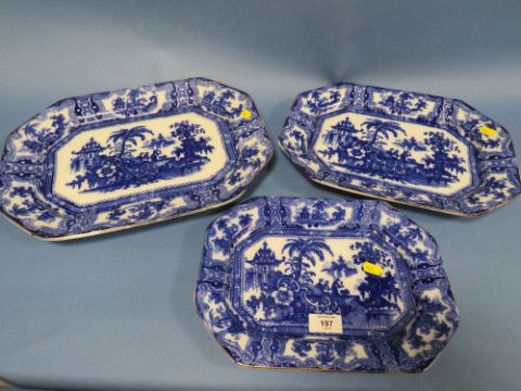 A SET OF THREE GRADUATED BLUE AND WHITE IRONSTONE OCTAGONAL PLATTERS