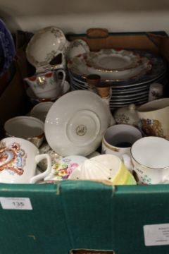 TWO TRAYS OF ASSORTED CERAMICS AND COLLECTABLES TO INCLUDE LIBERTY BLUE - BLUE AND WHITE PATTERN PLATES. BESWICK SCROOGE CHARACTER JUG, FIGURINES ETC