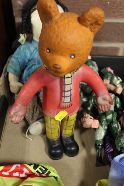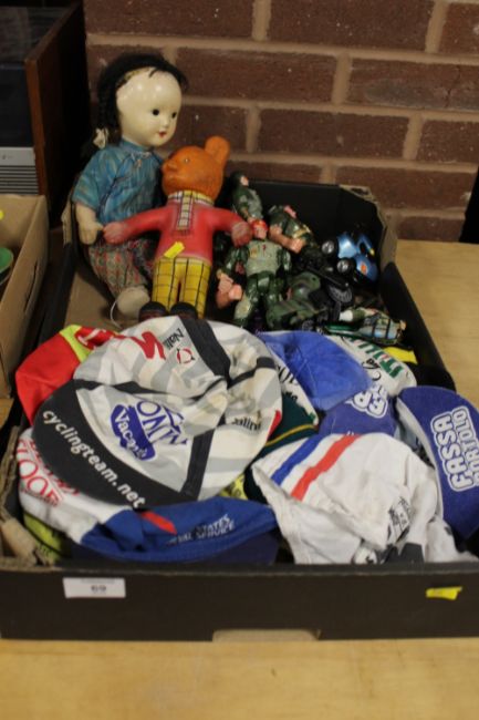 A TRAY OF ASSORTED COLLECTABLES COMPRISING AN ORIENTAL DOLL, ACTION FIGURES AND A COLLECTION OF CYCLING TEAM CAPS