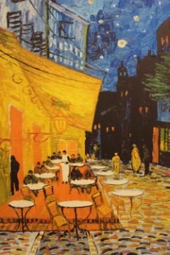 A LARGE CANVAS PRINT OF AN IMPRESSIONIST PAINTING OF A STREET CAFE SCENE - H 125 CM W 76.5 CM