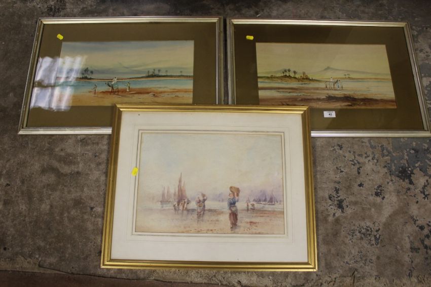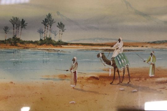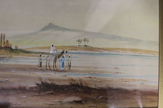 A PAIR OF FRAMED AND GLAZED MIDDLE EASTERN WATERCOLOURS SIGNED H.S.LYNTON LOWER LEFT - h 25 CM W 47 CM TOGETHER WITH ANOTHER WATERCOLOUR (3)