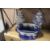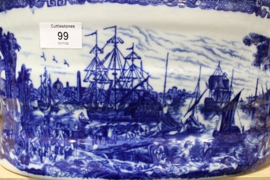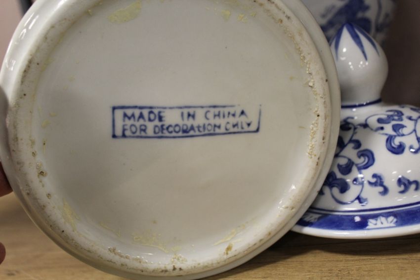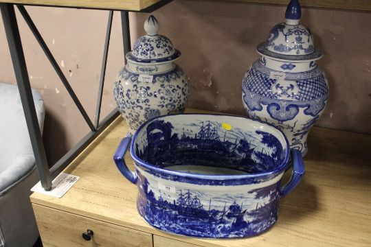 TWO MODERN LARGE ORIENTAL STYLE BLUE AND WHITE LIDDED GINGER JARS TOGETHER WITH A FOOTBATH