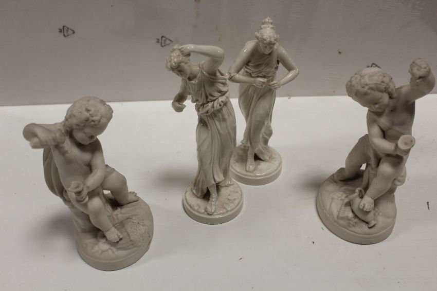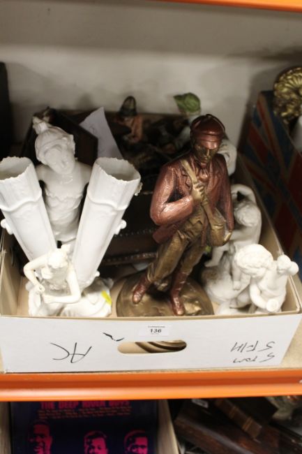 A TRAY OF ASSORTED FIGURINES TO INCLUDE CERAMIC EXAMPLES, A BRONZED EFFECT GOLFING FIGURE ETC