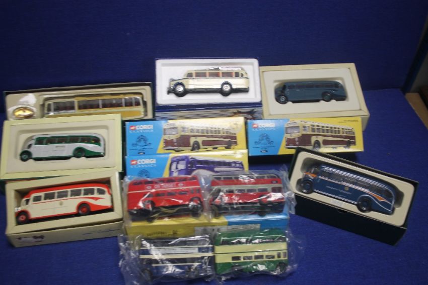 A COLLECTION OF 10 BOXED CORGI BUSES TO INCLUDE BEDFORDS,br.