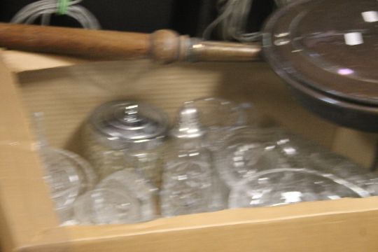 THREE TRAYS OF CERAMICS AND GLASSWARE TOGETHER WITH A WARMING PAN (TRAYS NOT INCLUDED),br.