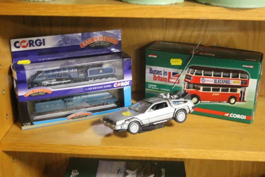 TWO CORGI TRAINS, A CORGI BUS AND A TOY CAR