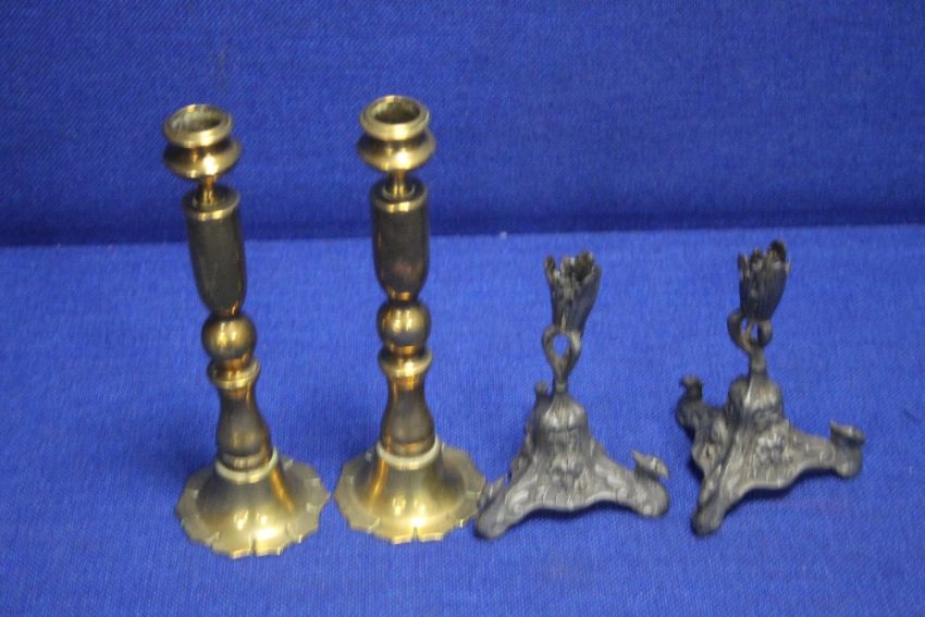 TWO PAIRS OF VINTAGE METAL CANDLESTICKS TOGETHER WITH A PAIR OF EPRERGNE BASES