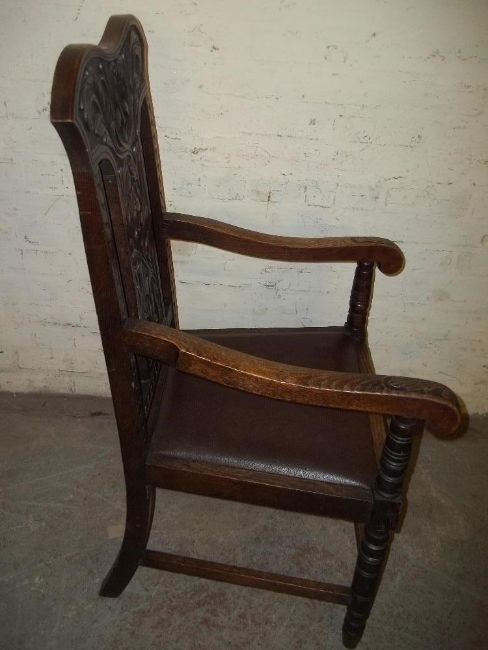 AN ANTIQUE OAK CARVED GRANDFATHER STYLE CHAIR