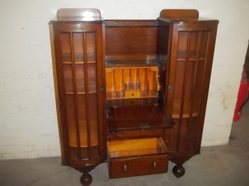 AN OAK LADIES WRITING BUREAU FLANKED BY 2 BOOKCASES
