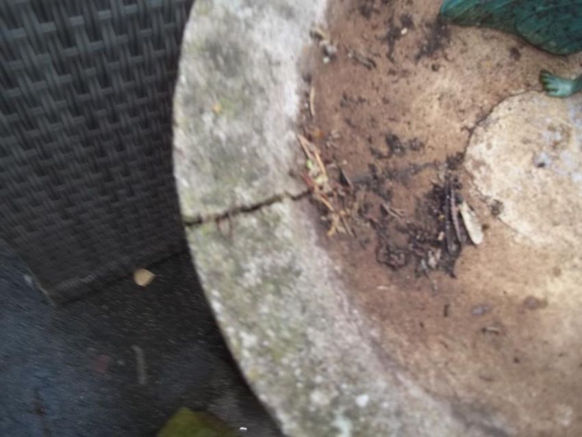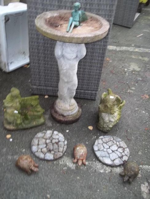 NINE ITEMS TO INCLUDE A CONCRETE BIRD BATH, STEPPING STONES AND STATUES