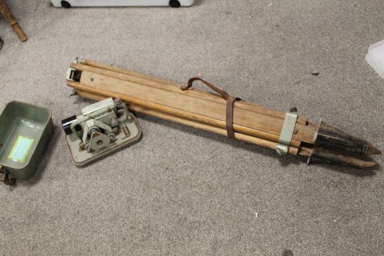 A SURVEYORS TRIPOD AND CASED LEVEL