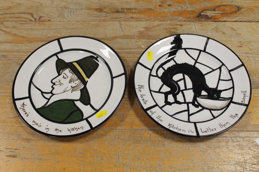 TWO BRISTOL LEADED LIGHTS POTTERY PLATES, ONE DEPICTING A PILGRIM PURITAN, THE OTHER A BLACK CAT DRINKING FROM A BOWL (2)