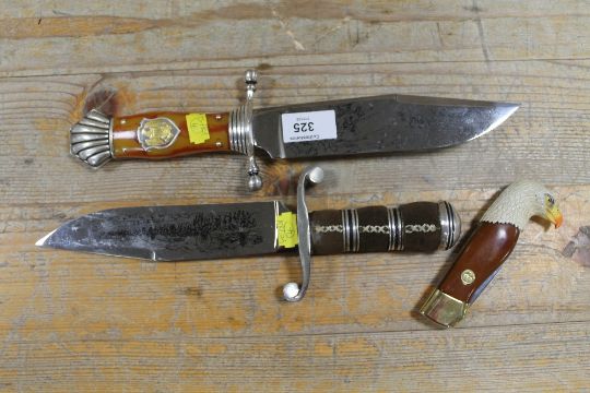TWO FRANKLIN MINT COLLECTABLE REPLICA DAGGERS TOGETHER WITH A FRANKLIN MINT FOLDING KNIFE WITH EAGLE HANDLE (3)