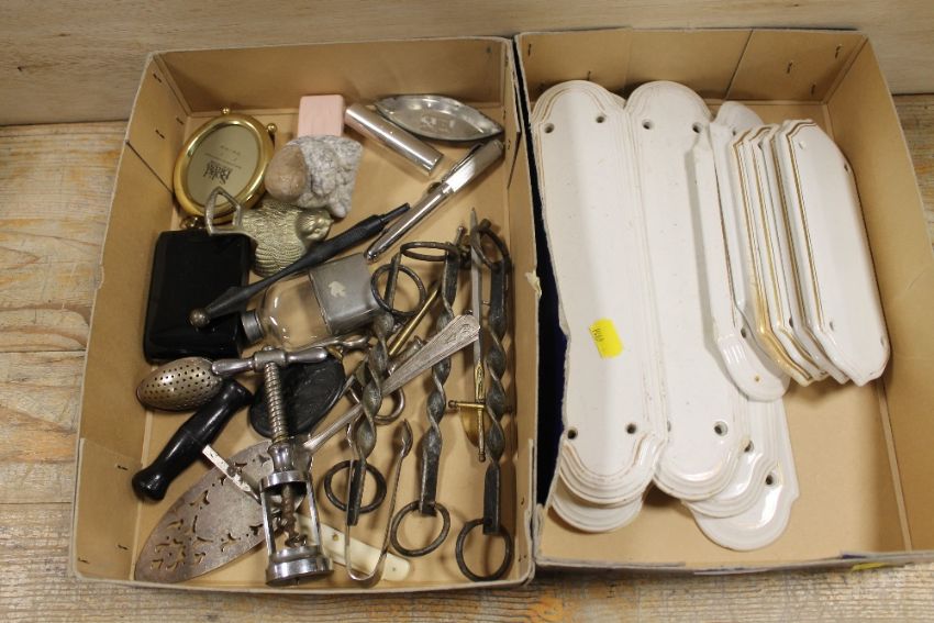 A SMALL TRAY OF COLLECTABLES TO INC CORKSCREWS, TOGETHER WITH A TRAY OF VINTAGE CERAMIC DOOR PLATES