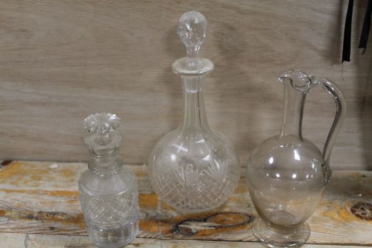 A CUT GLASS BANDED NECK DECANTER AND ANOTHER TOGETHER WITH A GLASS EWER (3)