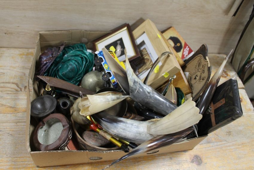 A TRAY OF COLLECTABLES TO INC A MALACHITE TYPE BOWL ETC