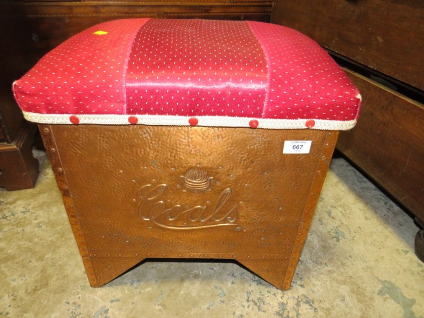 A VINTAGE COPPER AND UPHOLSTERED COAL BOX WITH TWIN HANDLES W-45 CM