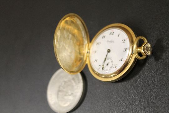 A BENTIMA STAR FULL HUNTER GOLD PLATED POCKET WATCH, TOGETHER WITH A COIN (2)