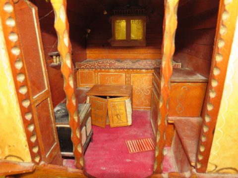 TWO VINTAGE SCRATCH BUILT TRAVELLERS CARAVANS AND TWO CERAMIC HORSES