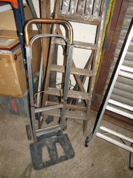 A SET OF ALLOY STEPS, WOODEN STEPS, SACK TRUCK ETC