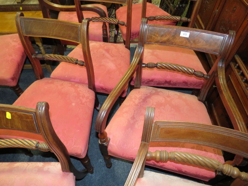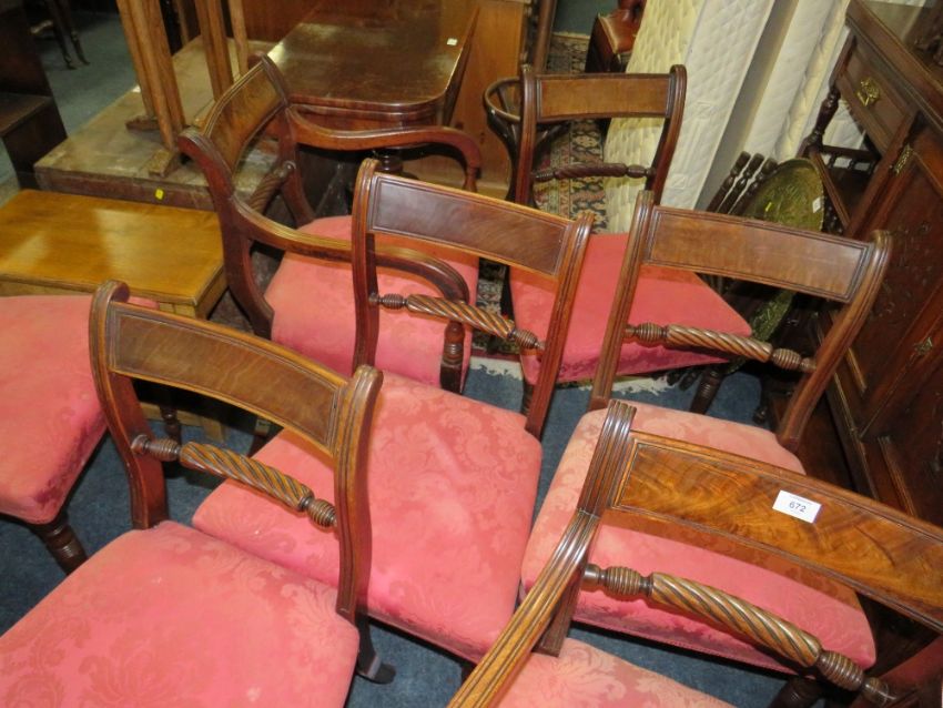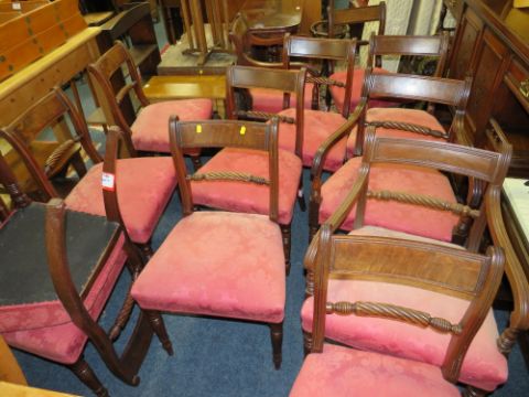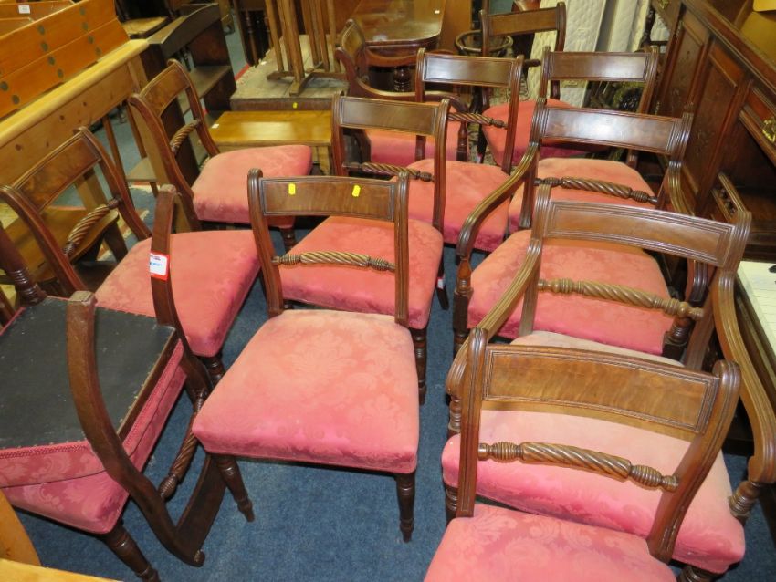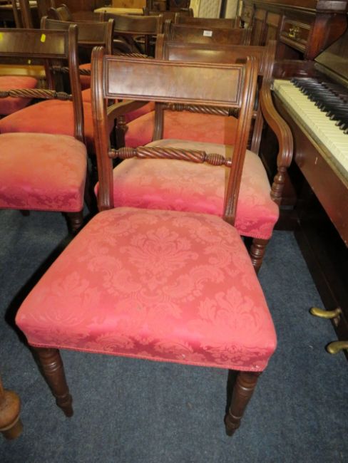 A SET OF THIRTEEN GEORGIAN MAHOGANY DINING CHAIRS WITH TWIST MID RAILS AND RAISED ON TURNED SUPPORTS (13)