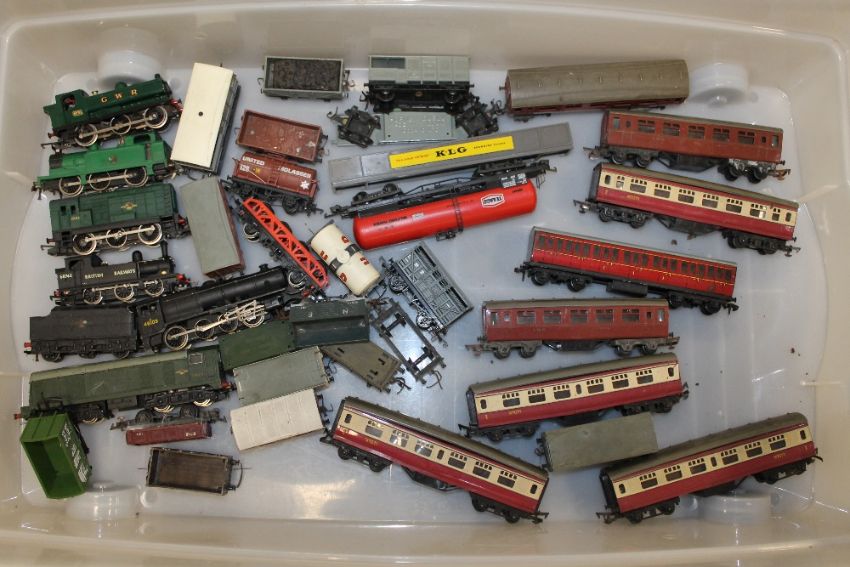 A COLLECTION OF VINTAGE HORNBY LOCOMOTIVES, TRAIN CARRIAGES, TENDER ETC TO INC A GWR 8751