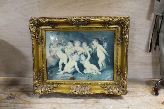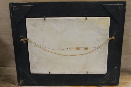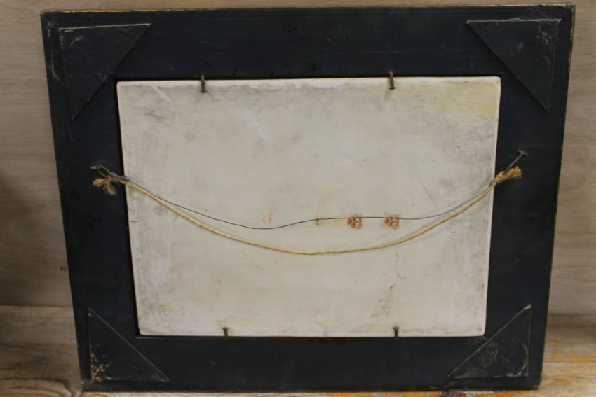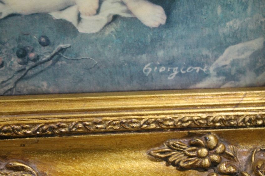 A LARGER GILT FRAMED PORCELAIN PLAQUE DEPICTING PUTTI FIGURES SIGNED LOWER RIGHT GIORGIONE (FADED AND CRAZED) STAMPED AND IMPRESSED VIENNA MARKS TO REVERSE