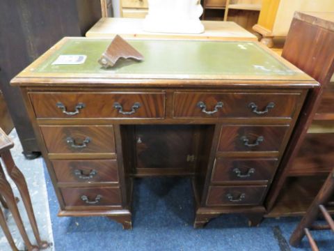 A REPRODUCTION MAHOGANY KNEEHOLE DESK WITH GREEN LEATHER TOP, TOGETHER WITH A NEAT OF TABLES (2) A/F