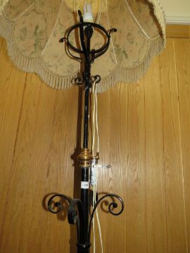A VINTAGE LATE 19TH CENTURY WROUGHT / BRASS LAMP STAND AND RETRO SHADE