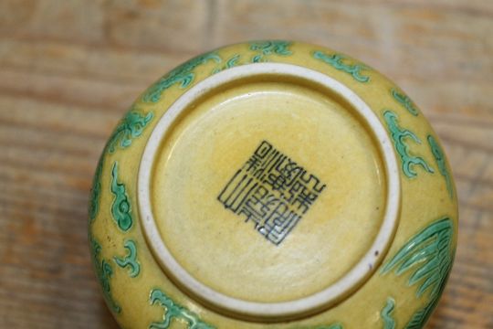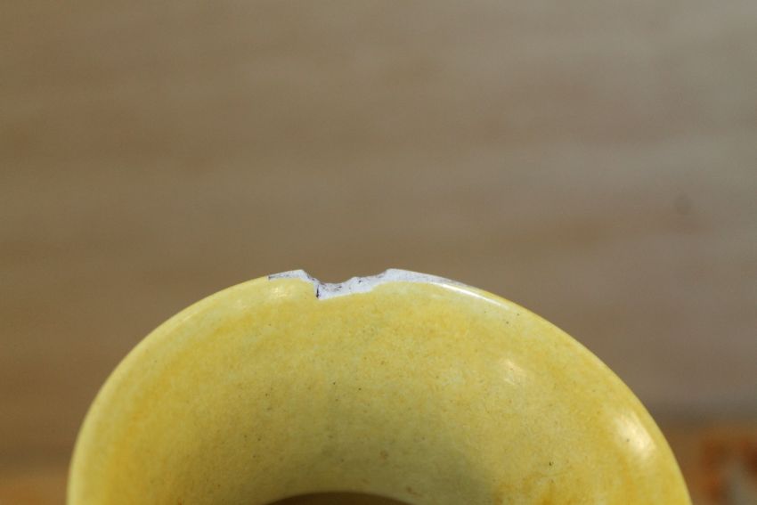 A SMALL YELLOW GROUND CHINESE VASE WITH CHARACTER MARK TO BASE - LARGE CHIP TO RIM