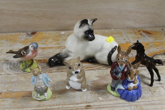 A COLLECTION OF SEVEN ANIMAL FIGURES TO INCLUDE ROYAL DOULTON BUNNYKINS FAMILY PHOTOGRAPH, A BESWICK BEATRIX POTTER JOHNNY TOWN-MOUSE ETC