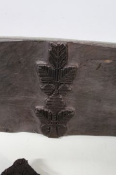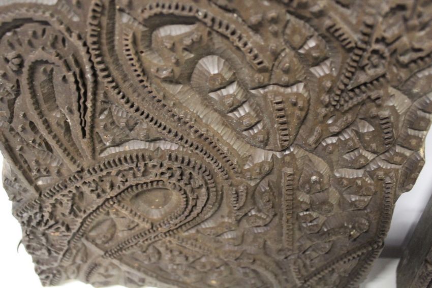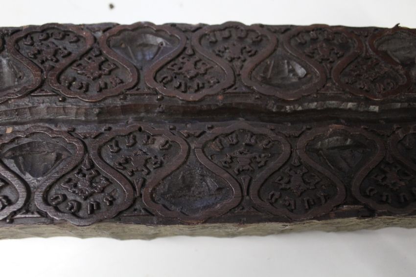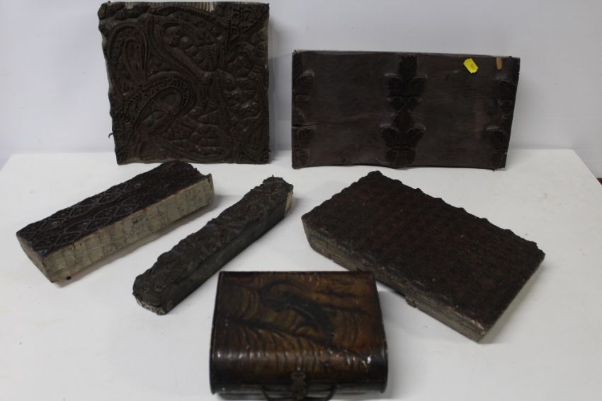 A TRAY OF VINTAGE WOODEN PRINTING BLOCKS TOGETHER WITH A HUNTLEY & PALMER TIN IN THE FORM OF A HANDBAG