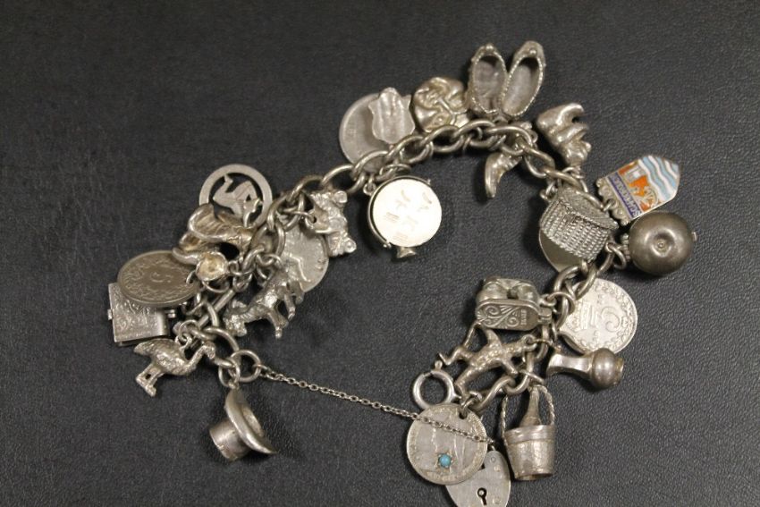 A HALLMARKED SILVER CHARM BRACELET WITH MANY CHARMS - APPROX WEIGHT 93.9 G