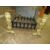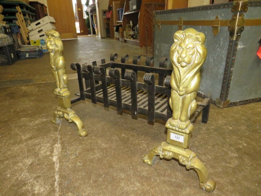 A PAIR OF LARGE BRASS AND CAST LION FIRE DOGS WITH A FIRE GRATE