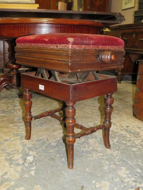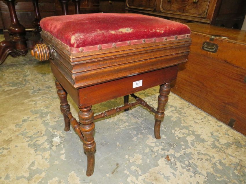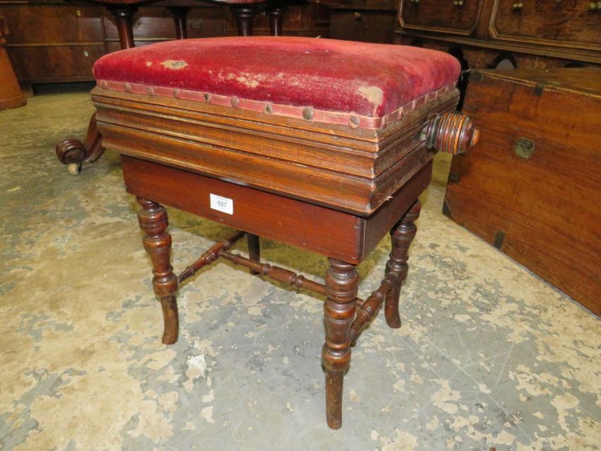 AN EDWARDIAN OAK ADJUSTABLE PIANO STOOL