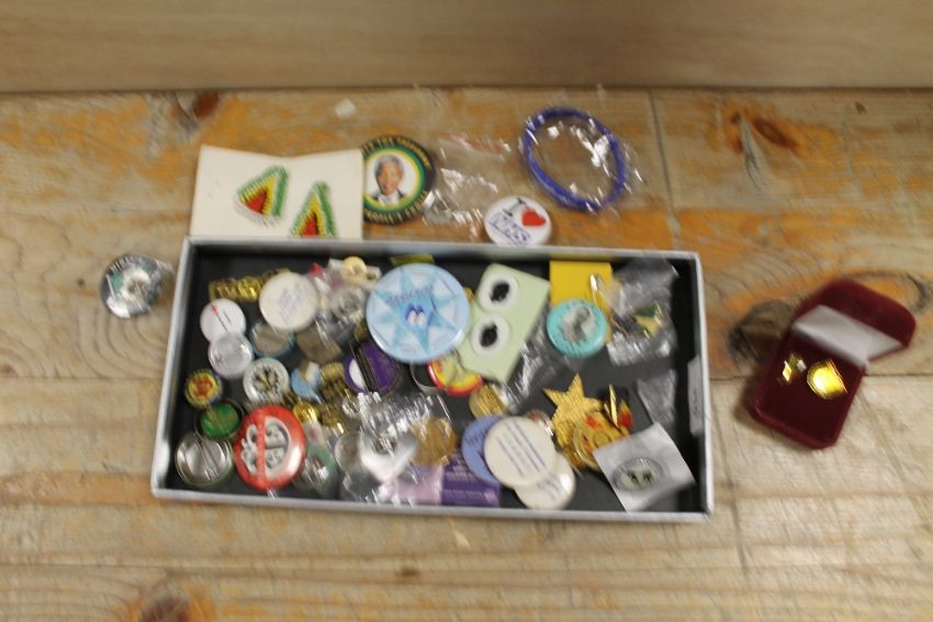 A COLLECTION OF VARIOUS PIN BADGES ETC TO INC A 'NELSON MANDELA FOR PRESIDENT' EXAMPLE`