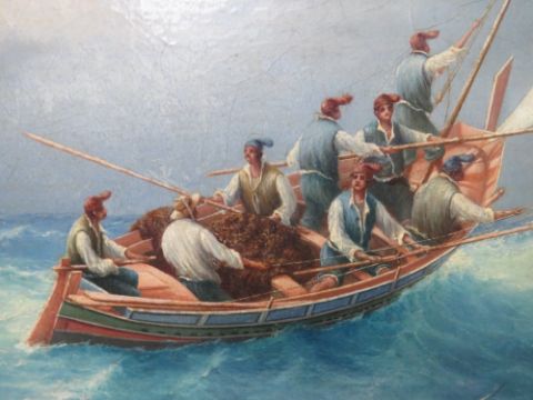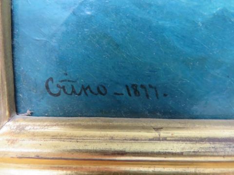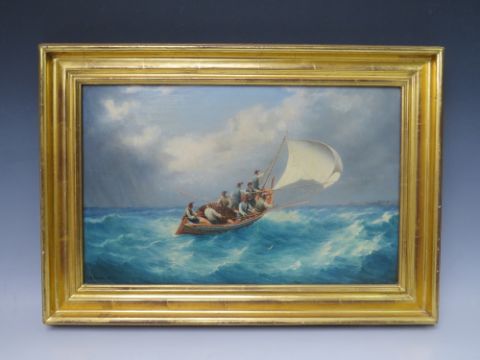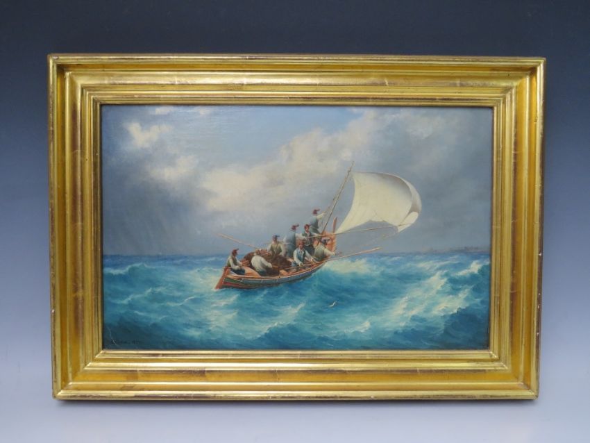 GINO. A stormy coastal seascape with figures in a sailboat approaching shorewards in a heavy swell, signed and dated 1877 lower left, oil on board, framed, 27 x 42 cm